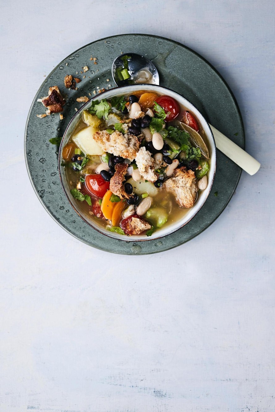 Valkosipuliöljyn kanssa paahdetut leipäpalat sakeuttavat kevyen kasvis-papukeiton. Minikalorit, maksimaku!