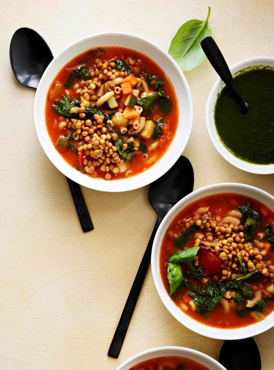 Makua ja väriä päivään! Tämä ihana kasvisminestrone on täydellinen lounaskeitto. Saat siitä ruokaisamman lisäämällä joukkoon kypsiä linssejä.