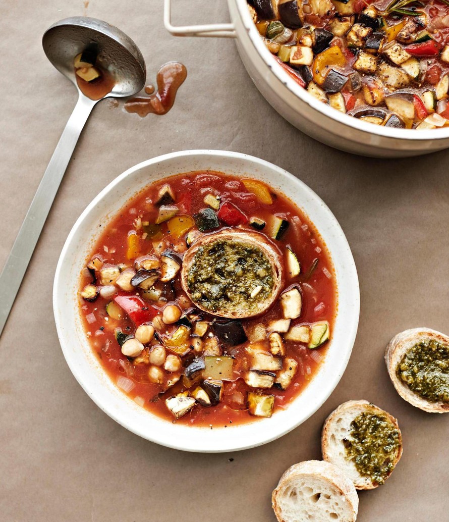 Ratatouillekeittoon kasvikset kannattaa pilkkoa pieniksi kuutioiksi, jolloin kypsyminen on nopeaa. Keiton pinnalle sopivat pestolla sipaistut, paahdetut patonkiviipaleet.