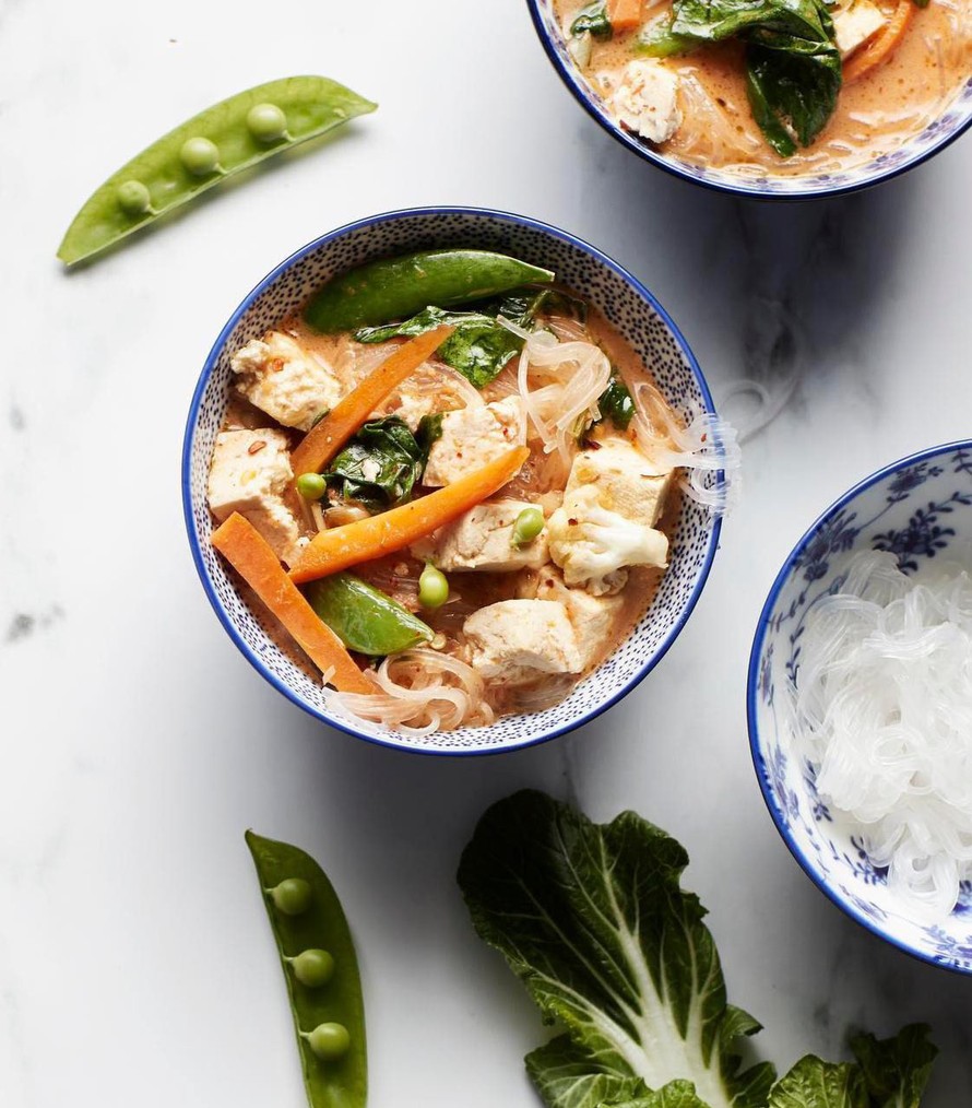 Lisää vesi, kookosmaitoa, currytahna ja kasvisliemikuutio ja keitä 5 minuuttia. Kuutioi sillä aikaa tofu. Laita nuudelit kulhoon ja kaada kiehuvaa vettä päälle.