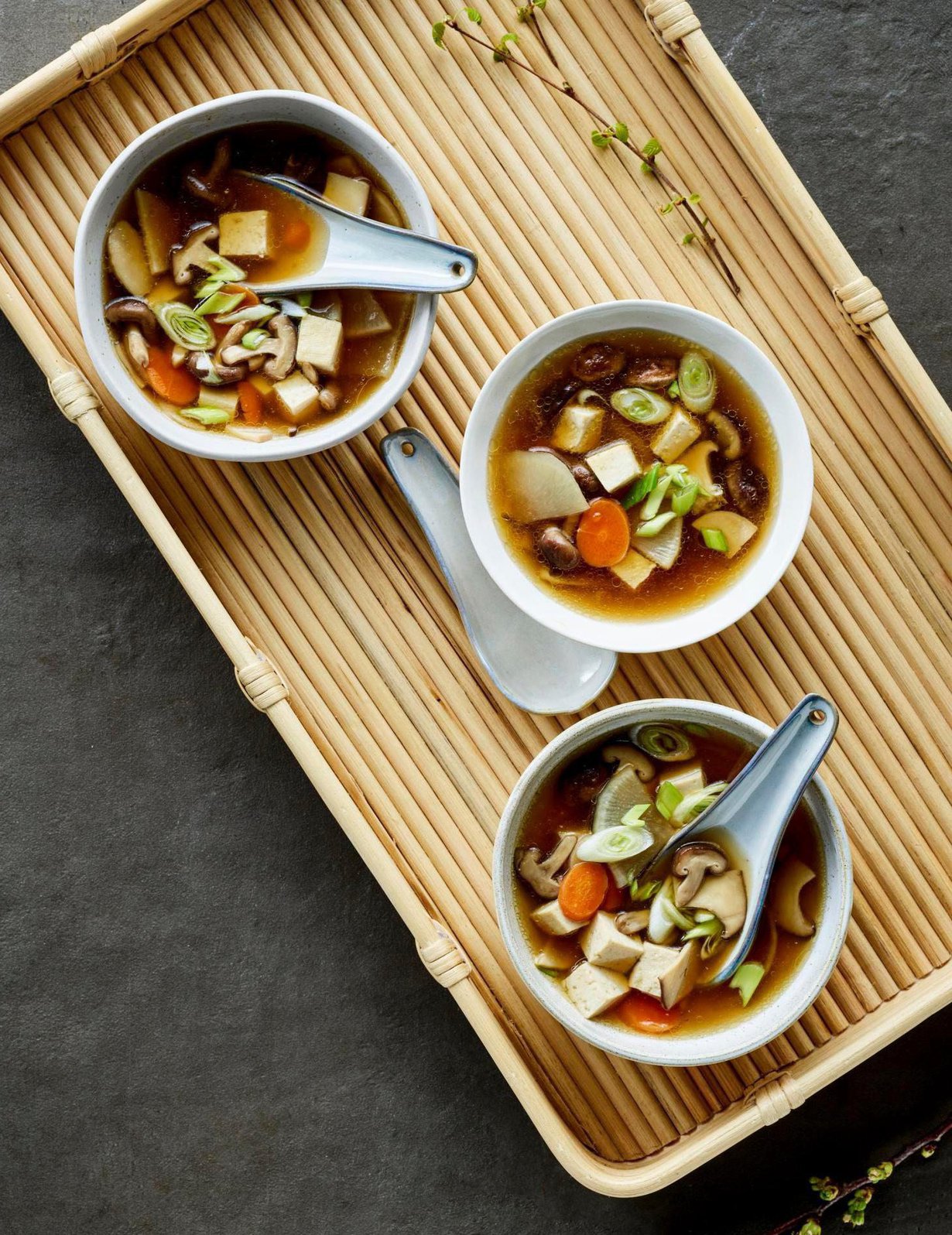 Kuumenna kasviöljy kattilassa. Lisää pannulle retikka, porkkanat ja siitakesienet, ja paista niitä hetki. Lisää joukkoon kasvisliemi, soijakastike sekä sokeri ja kiehauta. Vähennä lämpöä ja anna keiton kiehua hiljalleen miedolla lämmöllä noin 4 minuuttia, kunnes kasvikset ovat kypsiä.