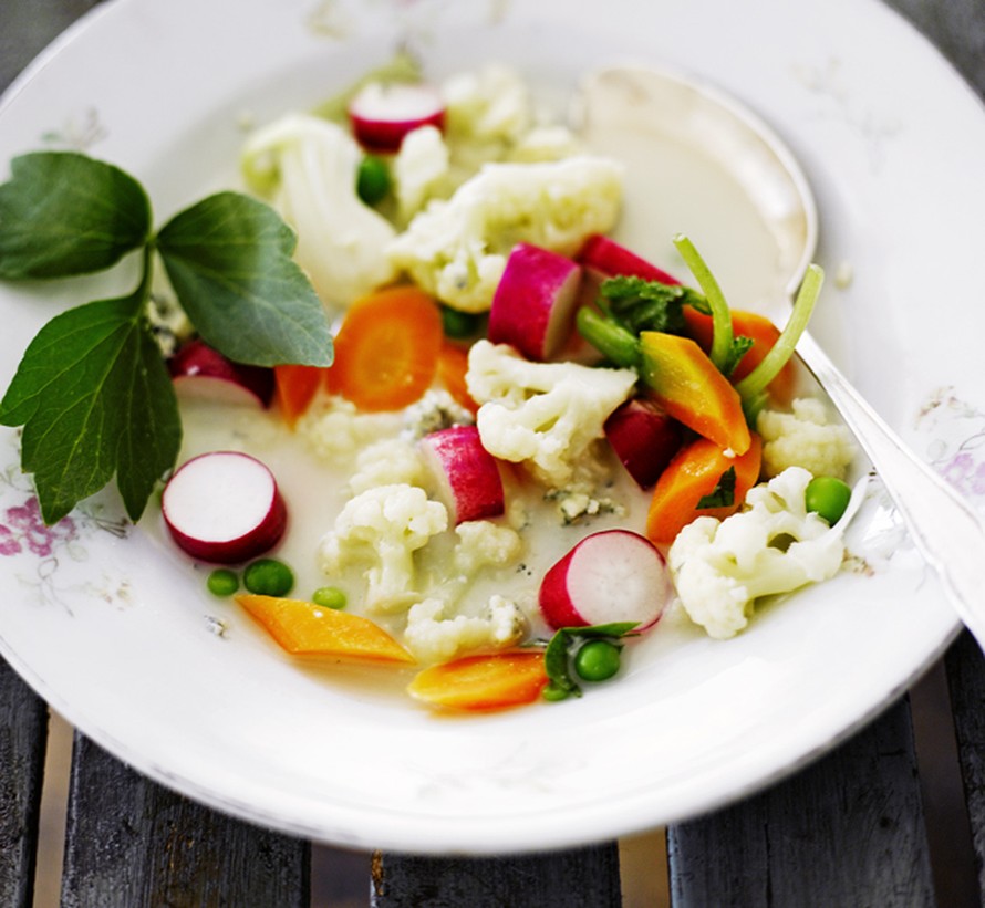 Uusi kesäkeitto tehdään tuoreista torin kasviksista ja viimeistellään sinihomejuustolla.