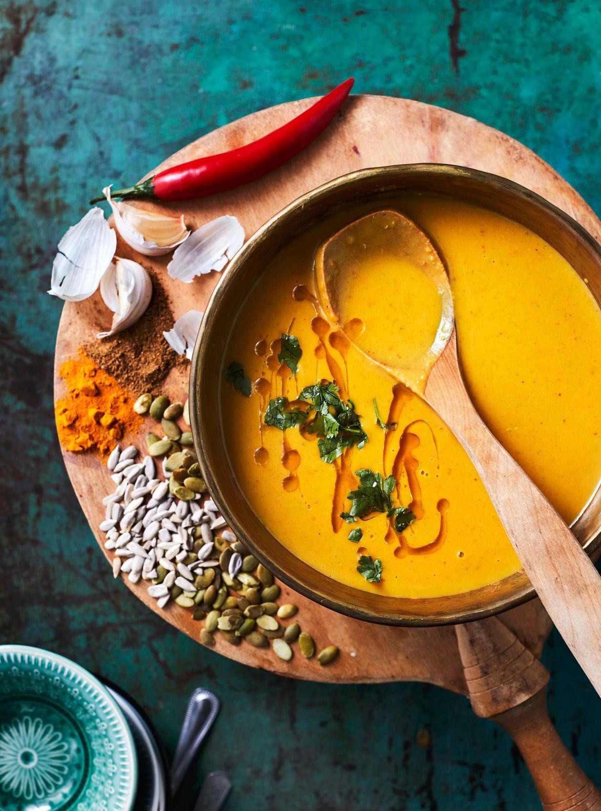 Soseuta keitto sauvasekoittimella. Varaa keiton kanssa tarjolle siemensekoitusta ja saksittua tuoretta korianteria.