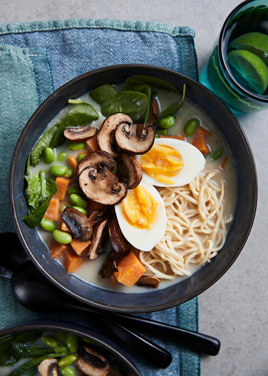 - Asettele lautasille nuudeleita ja tuoretta pinaattia. Kauho kuumaa keittoa päälle. Halkaise annosten pinnalle keitetty muna.