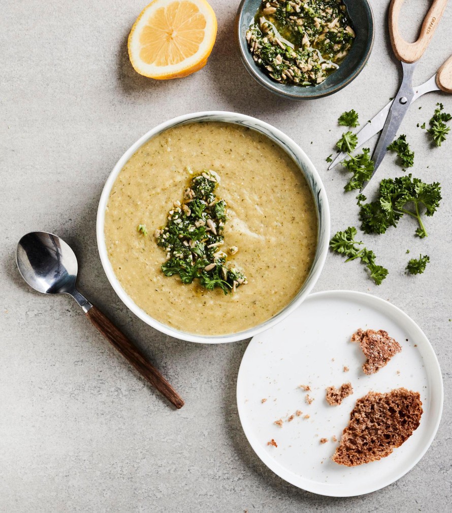 Soseuta sileäksi sauvasekoittimella. Tarjoile keiton kanssa siemen-persiljapestoa.