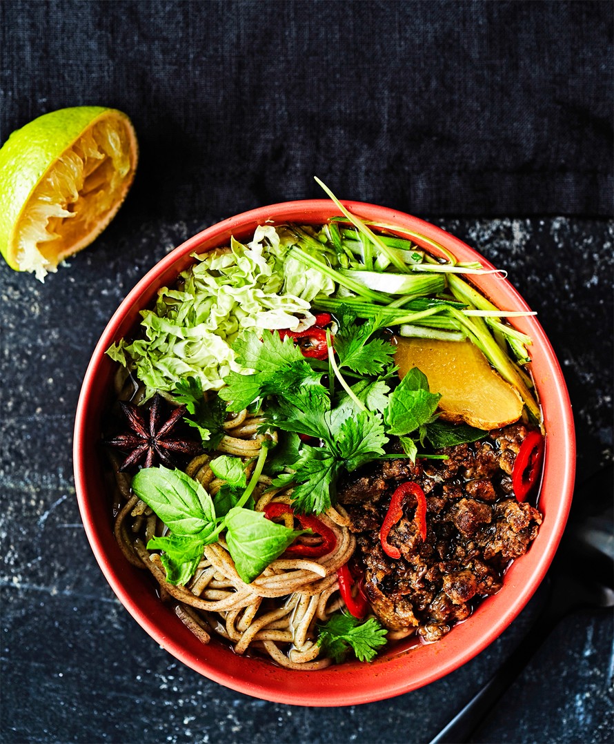 Kasviksilla höystetty makoisa pho-keitto valmistuu puolessa tunnissa. Jo haluat keitosta vegaanisen, voit vaihtaa kalakastikkeen soijaan.
