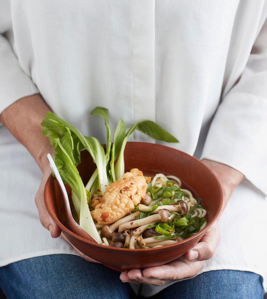 - Kauho lautasille nuudelit, paksoit, sienet ja höyryävää lientä.