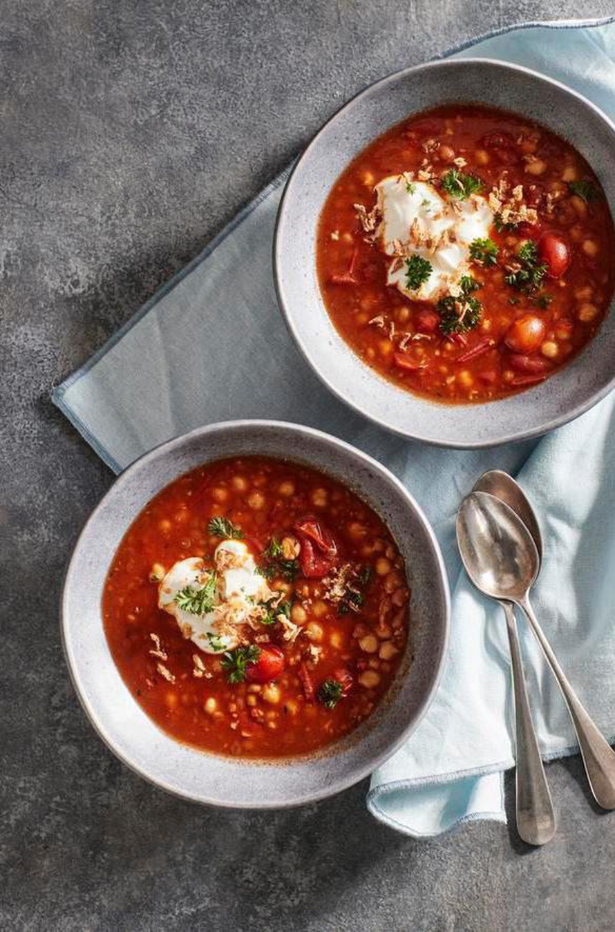Viiden minuutin urakka ja lyhyt haudutus, ja lautasella höyryää täyteläinen kasviskeitto. Edes sipulia ei nyt tarvitse pilkkoa! Keitä kattilassa purkillinen kirsikkatomaatteja, linssejä ja kikherneitä. Jos kotoa löytyy säilykepapuja, niitäkin voi käyttää.