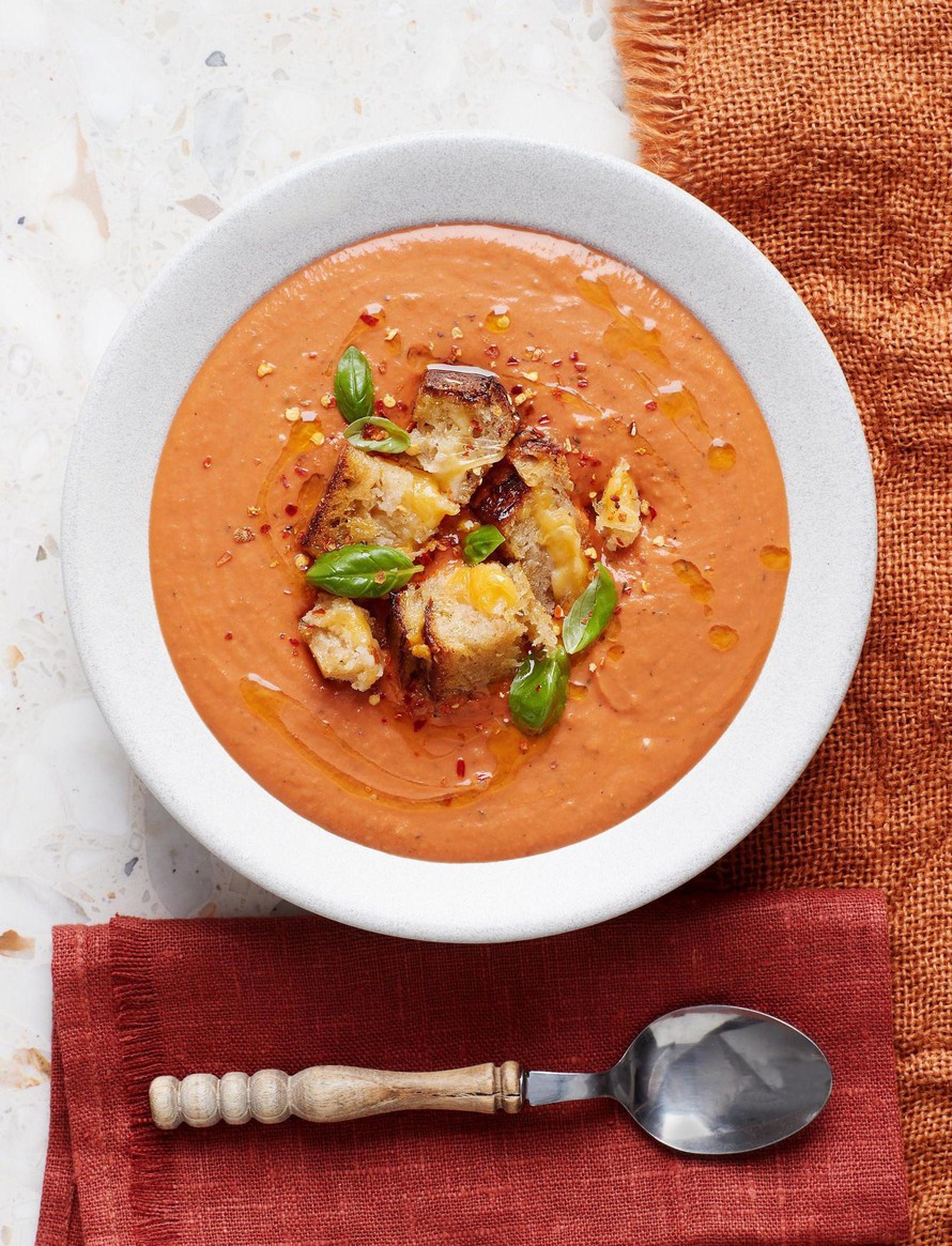 Viimeistele keitto basilikan lehdillä, oliiviöljyllä ja chilihiutaleilla. Tarjoa juustokrutonkien kanssa.