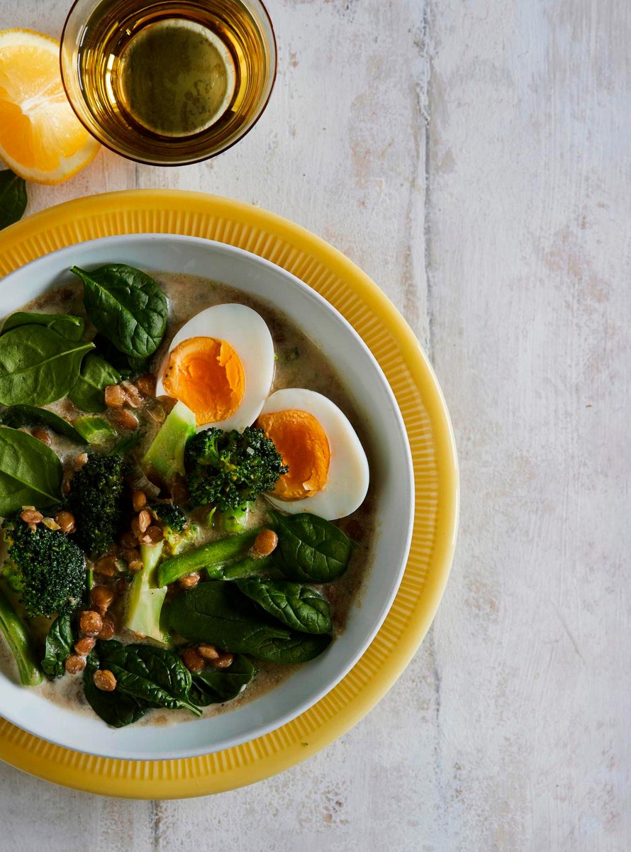 Linssit ja kananmunat tekevät vihreästä kasviskeitosta ruokaisan lounaan. Parsakaalista ja pinaatista saat hermoston toimintaa tukevaa folaattia.
