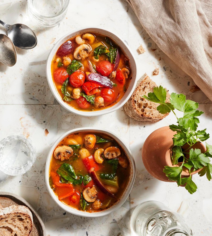 Huuhtele kirsikkatomaatit, pinaatinlehdet ja lehtisellerit. Viipaloi lehtisellerit. Huuhtele paprika, halkaise ja poista siemenkodat ja kanta, viipaloi. Puhdista sienet ja viipaloi. Kuori ja viipaloi punasipuli ja valkosipulinkynnet. Kuumenna kasvisliemi (1 l vettä + 2 kasvisfondikuutiota).