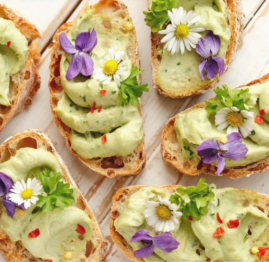 3. Paahda halutessasi leipäviipaleet. Levitä päälle runsaasti avokadoseosta, koristele persiljalla ja syötävillä kukilla.