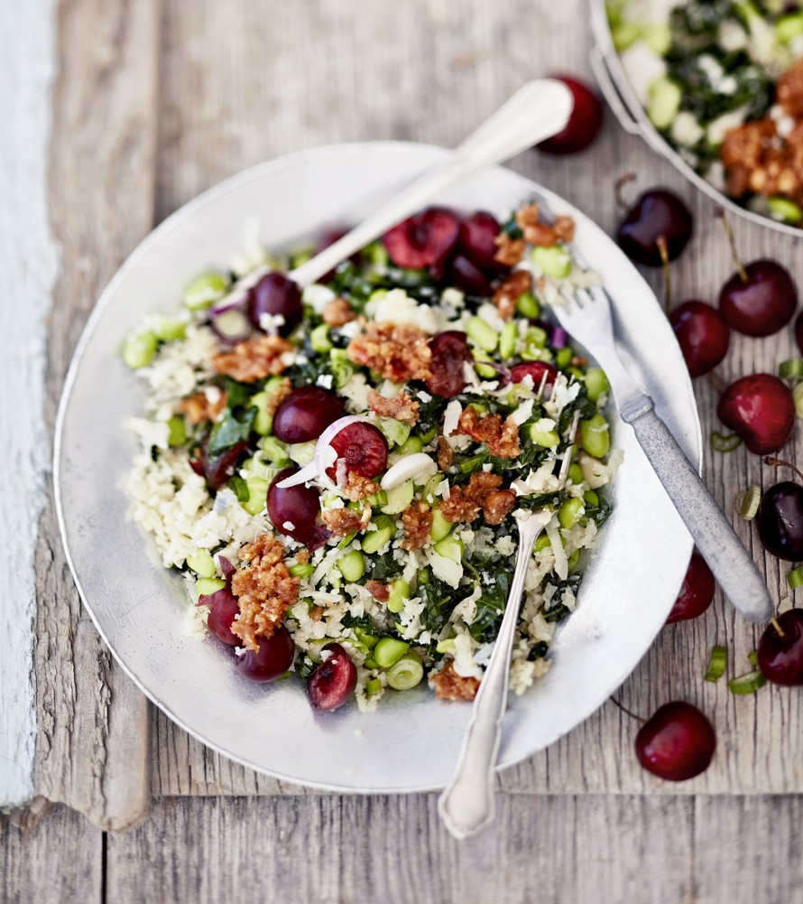 Kukkakaalia paistetun riisin tyyliin. Maukkaina sattumina papuja, lehtikaalia ja marjoja. Varoitus: tähän on helppo jäädä koukkuun.
