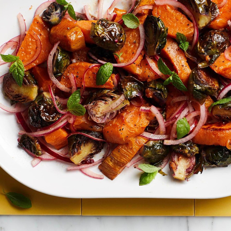 Kumoa paahdetut kasvikset kulhoon ja nostele kastikkeen kanssa sekaisin. Lisää suolaa tarvittaessa. Nypi lopuksi mintusta lehtiä koristeeksi.