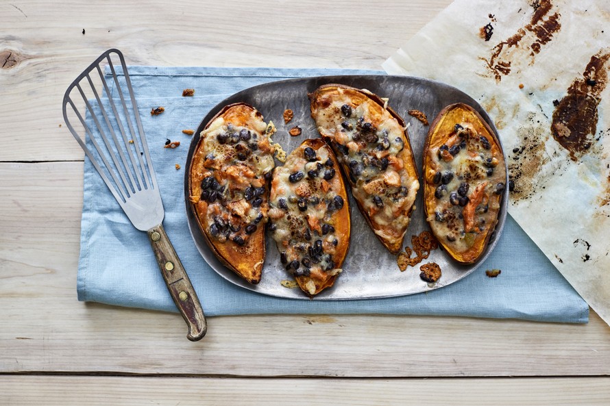 Uunissa makeaksi paahtuvat bataatit täytetään cheddar-juustolla pehmennetyllä mustapaputäytteellä. Säväys inkivääriä ja limeä ryhdistää lempeän aterian.