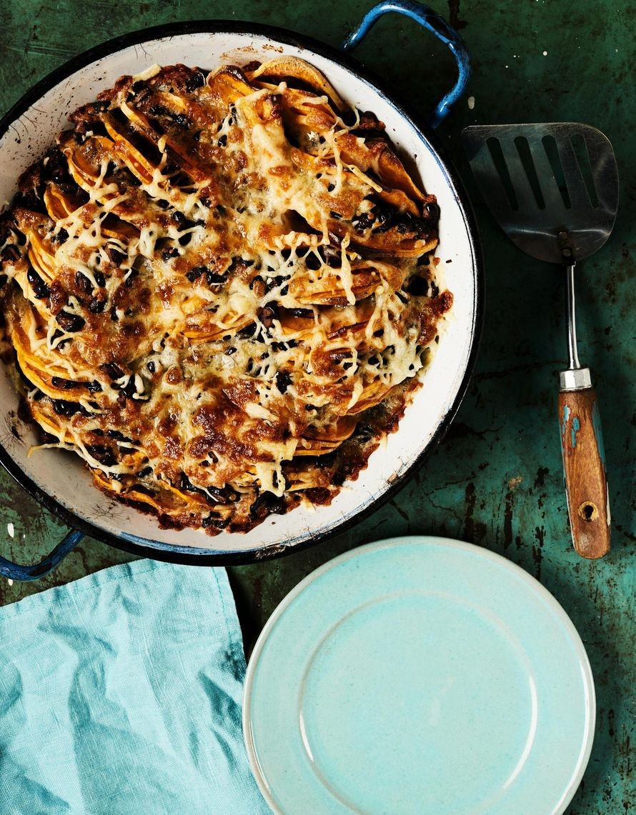 Herkullinen bataatti-mustapapuvuoka sisältää paljon kuitua. Se pitää nälän loitolla pitkään.