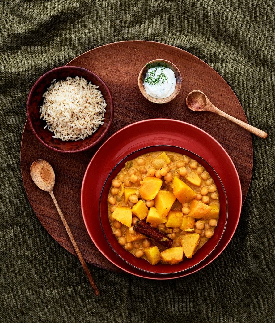 Kookosmaito pyöristää maut, ja kypsät kikherneet lisäävät annoksen ruokaisuutta. Eikä curry vaadi haudutusta kuin 20 minuuttia, jonka aikana ehtii keittää riisin ja tehdä yrtti-jogurttikastikkeen.