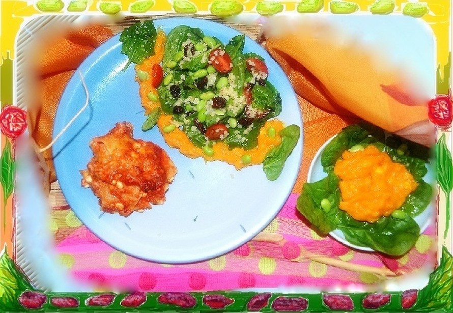 lasagnelevyjä, mifu-ruokarakeita, maitoa, emmental-juustoraastetta, vehnäjauhoja, jauhettua valkopippuria, tomaattimurskaa, sipulia, valkosipulinkynttä, vettä, kasvisliemikuutio, oivariini juokseva rasvaseos, suolaa, karpaloita, soijapapuja(pakaste), porkkasosetta, tuoretta inkivääriä, seesamiöljyä, riisiviinietikkaa, kvinoaa (Go green), tuoretta pinaattia, kirsikka tomaatteja, misokeittoaineksia (Saitaku tai samantyylisiä),