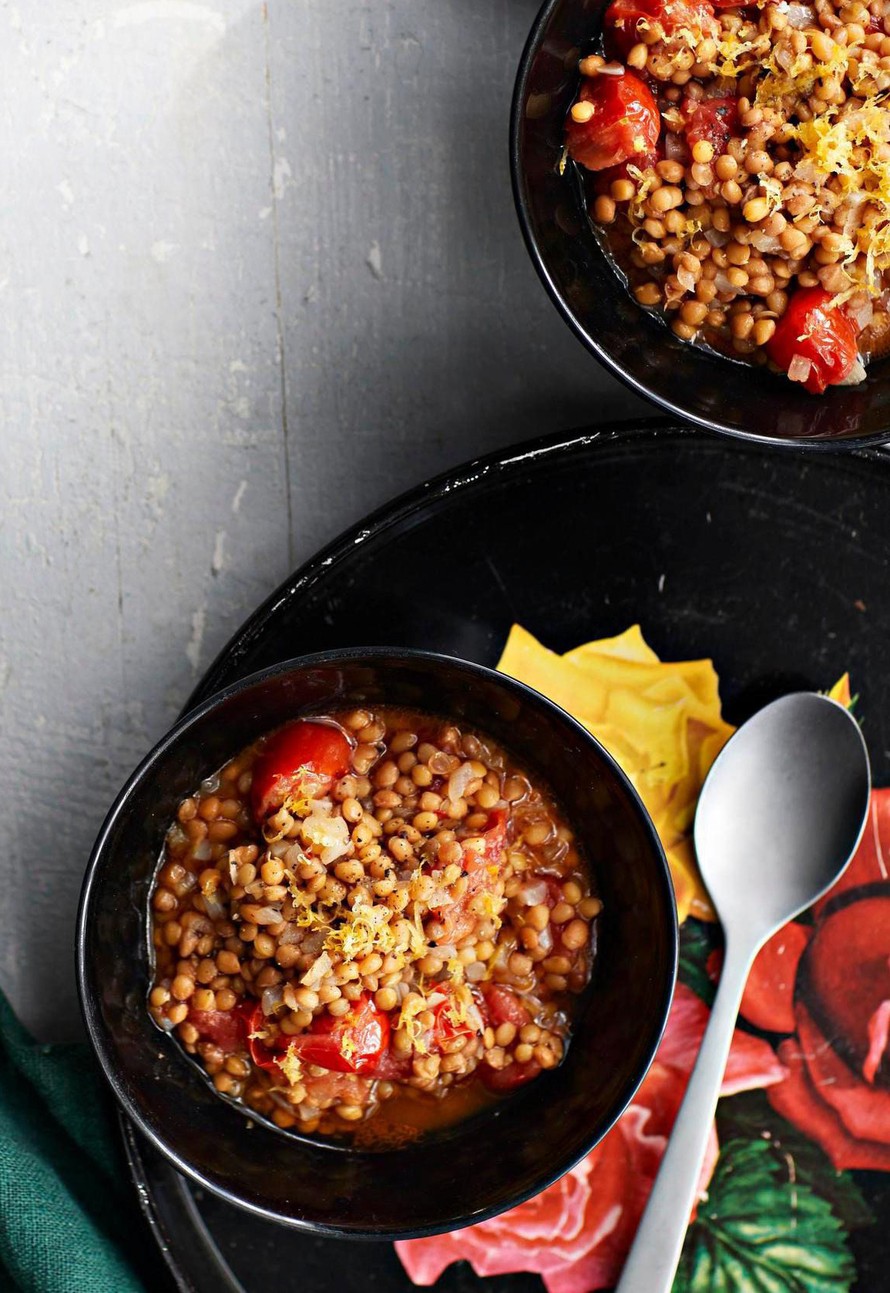 Kuumenna öljy pannussa. Lisää sipuli, tomaatit ja harissatahna. Kuullota 2–4 minuuttia, lisää sitten linssit sekä 1½ dl linssien lientä.