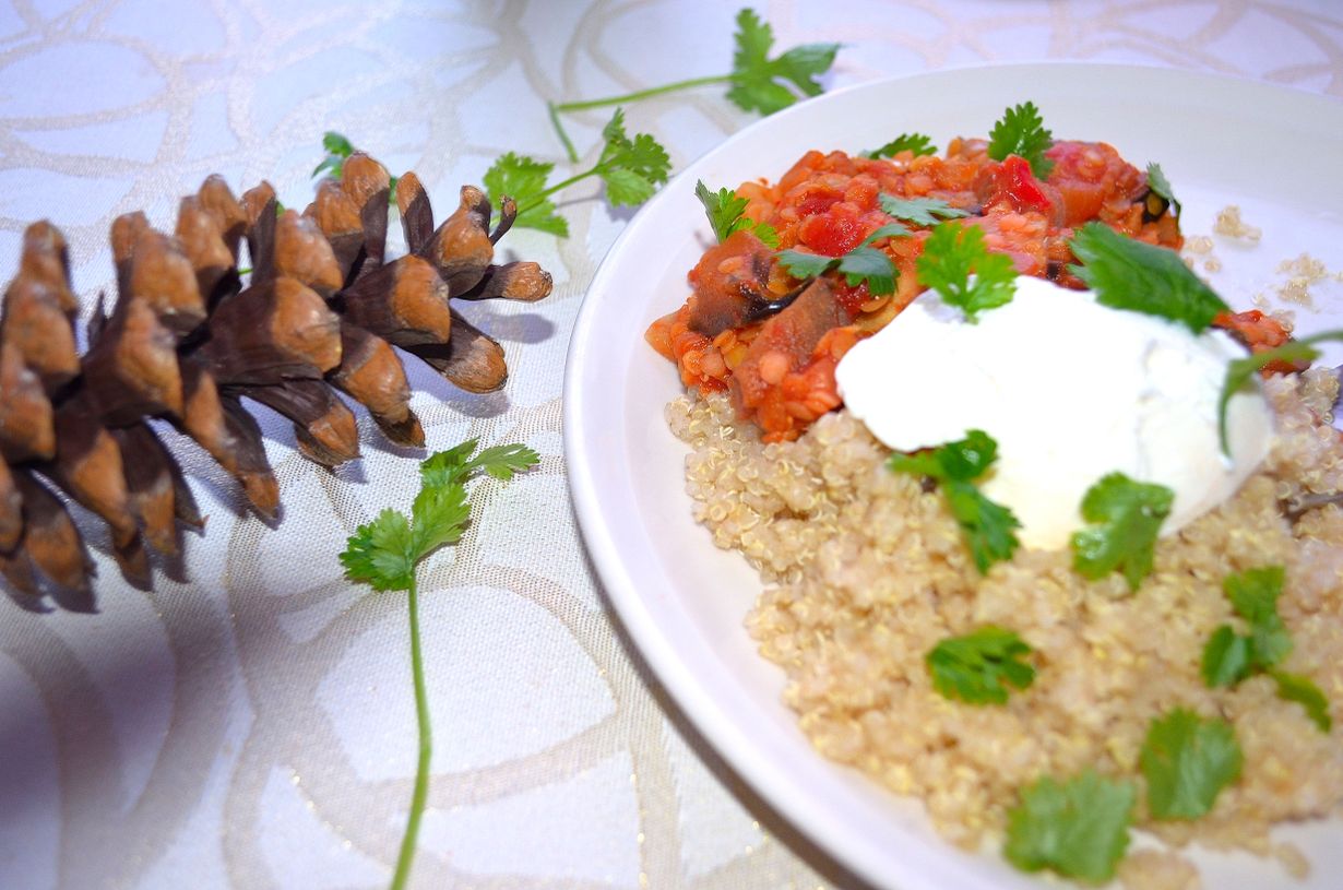 munakoiso, kvinoa (Go green), turkkilaista jogurttia, valkosipulin kynttä, sipulia, punainen chili, öljyä, tomaattisosetta, juustokumina, tomaatteja tölkissä, vettä, punaisia linssejä, suolaa, tuoretta korianteria, mustapippuria