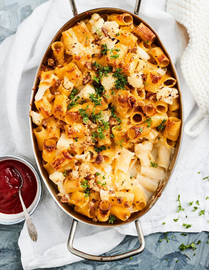 Makaronilaatikon juustoinen versio kaipaa vain lämmitystä ja kaverikseen lusikallisen ketsuppia.