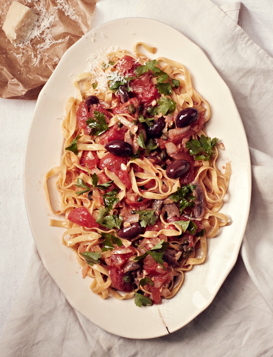 Voimakkaan makuiset ja suolaiset ainekset saavat parikseen tuoreita tomaatteja ja persiljaa. Ne tasapainottavat tämän intensiivisen pastan makua.