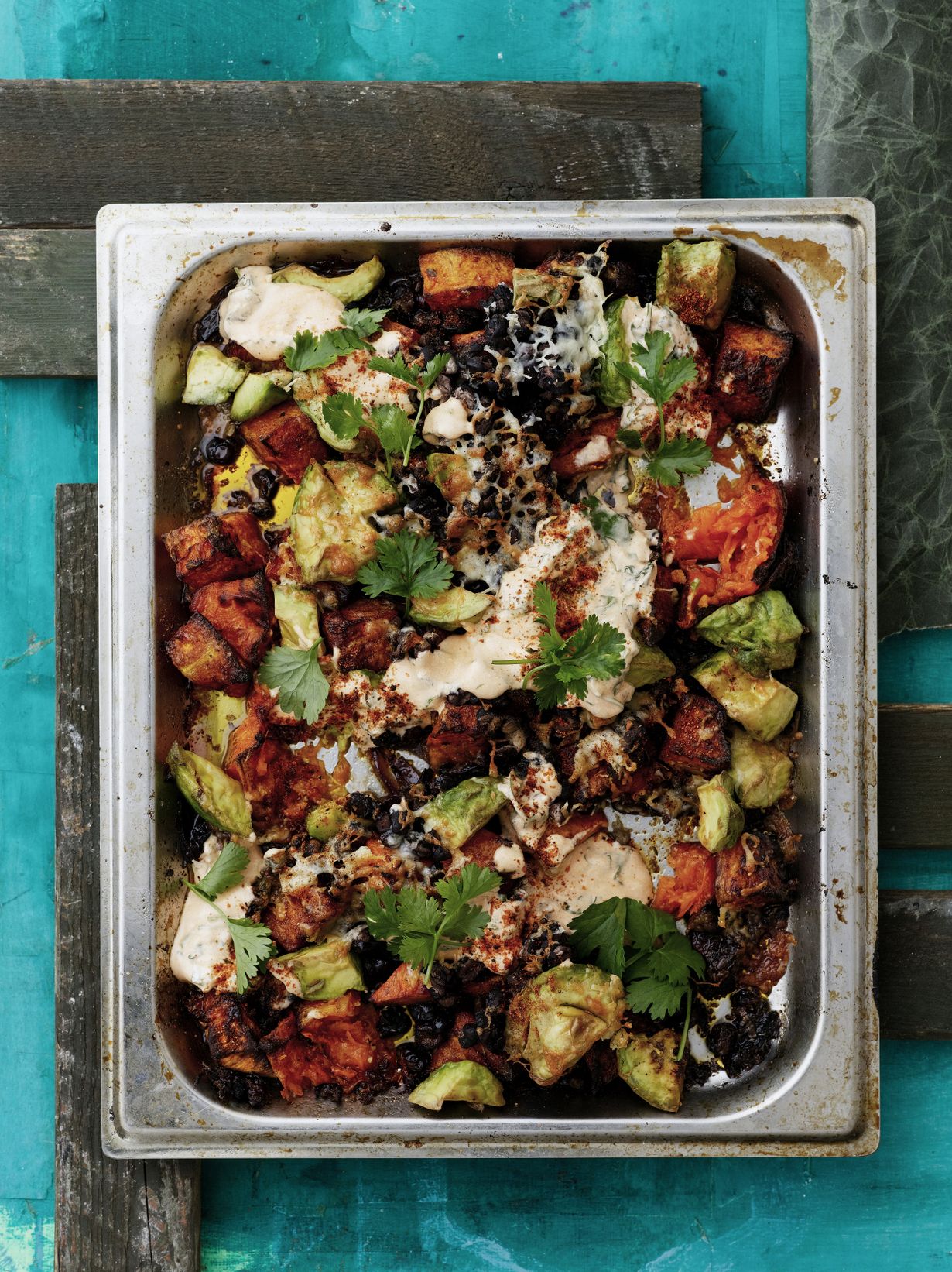 Paahtaminen antaa kurpitsalle upean maun, ja tuliset texmex-mausteet sopivat täydellisesti makean kurpitsan seuraan. Pavut, avokado ja korianteri viimeistelevät tyylin. Kaikki yhdellä pellillä –illallinen on helppo tehdä, ja syötät samalla isonkin porukan.