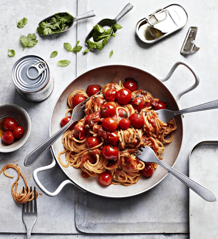 Säilykekirsikkatomaattien makeus ja harissa-tahnan chilinen polttavuus yhdistyvät nerokkaasti tässä alle puolen tunnin pastassa.