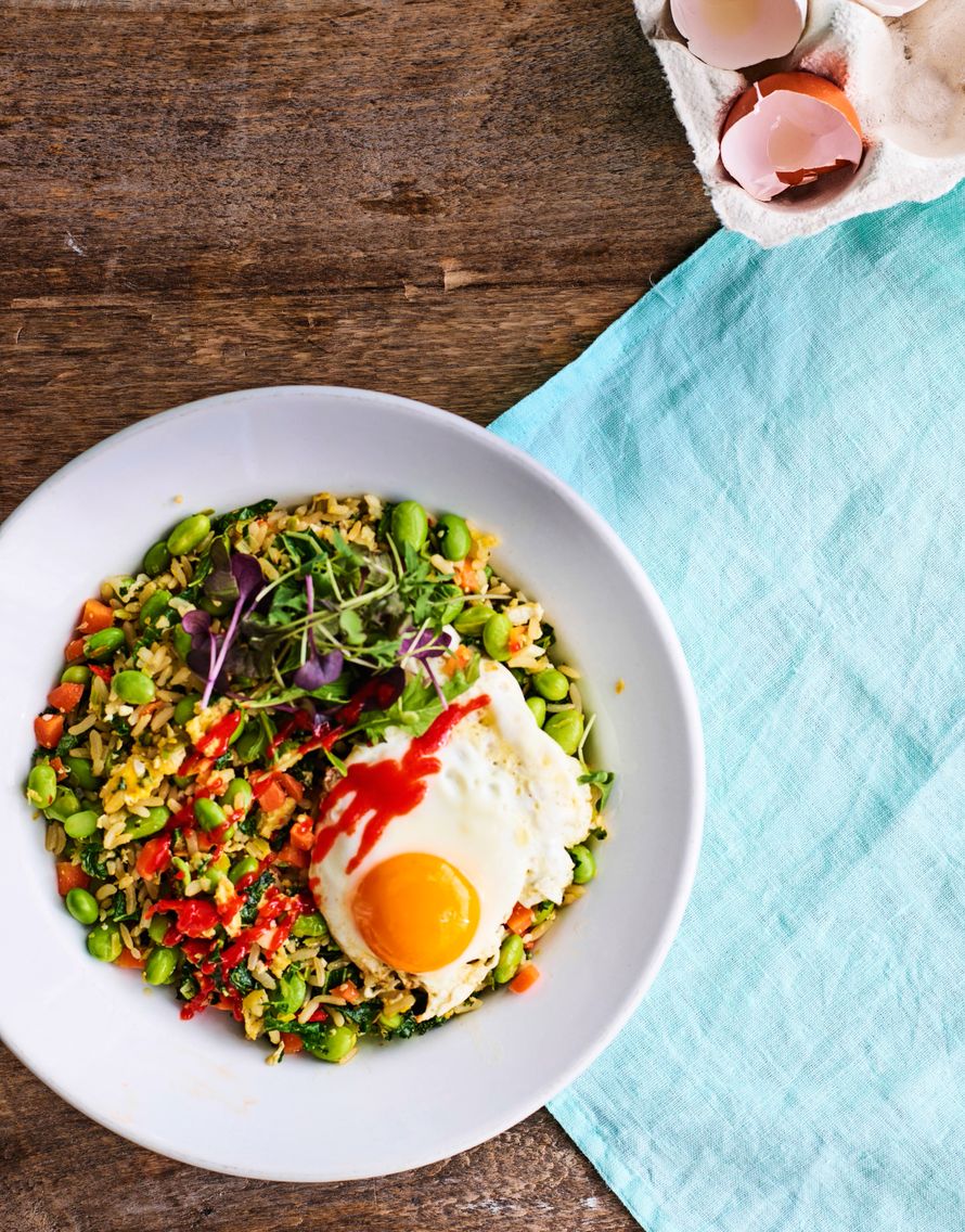 - Kerää kasvis-riisiseos paistinlastalla vokkipannun reunoille. Lisää tilkka öljyä pannun keskelle ja riko siihen kaksi munaa. Paista munia noin minuuttia koko ajan lastalla sekoitellen niin että munien rakenne rikkoontuu suikalemaiseksi. Sekoita munat riisi-kasvisseokseen ja kerää seos taas pannun reunoille. Paista keskustassa vielä toiset kaksi munaa häränsilmiksi annosten päälle. Tarjoa paistetun kasvisriisin kanssa chilikastiketta.