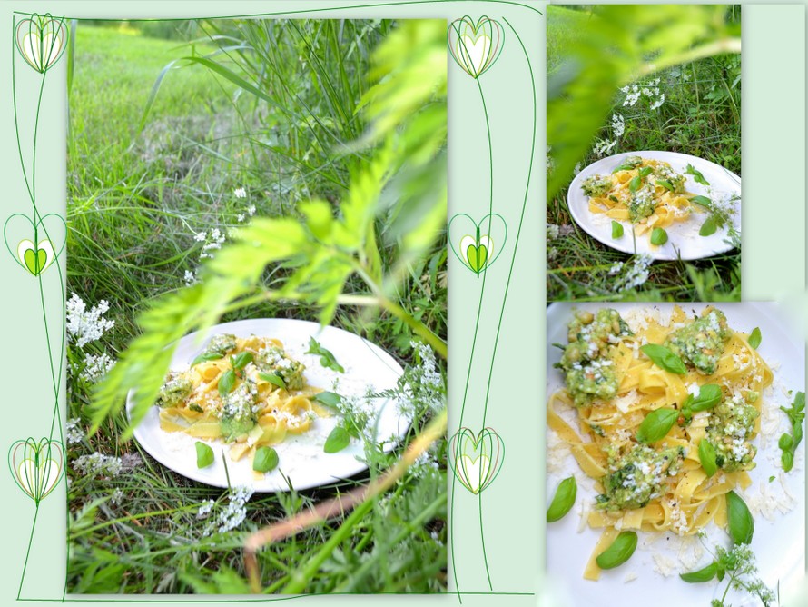 avocadoa, fettuccine tuorepastaa, pinjansiemeniä, valkosipulinkynttä, parmesaanijuustoa, oliiviöljyä, pastan keitinlientä, limemehua, suolaa, mustapippuria, basilikanlehtiä