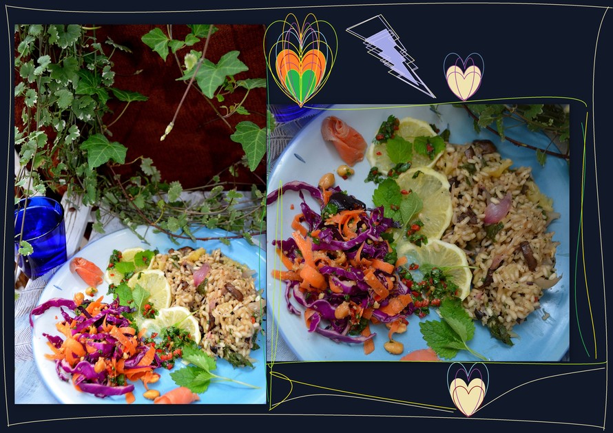 risottoriisiä, sienen kanta-ja helttaosuudet (Jaanatuulee "Täytetyt sienet vihreällä pestolla"- ruuasta jääneet sienen osat), sitruunaa, korianteri, punainen chili, seesamiöljy, limemehu, suolaa, sokeria, vettä, kasvisannosfondi, (graavilohi), salottisipuli, tuoretta sitruunamelissaa, suolapähkinöitä, porkkanaa, punakaalia, mustapippuria
