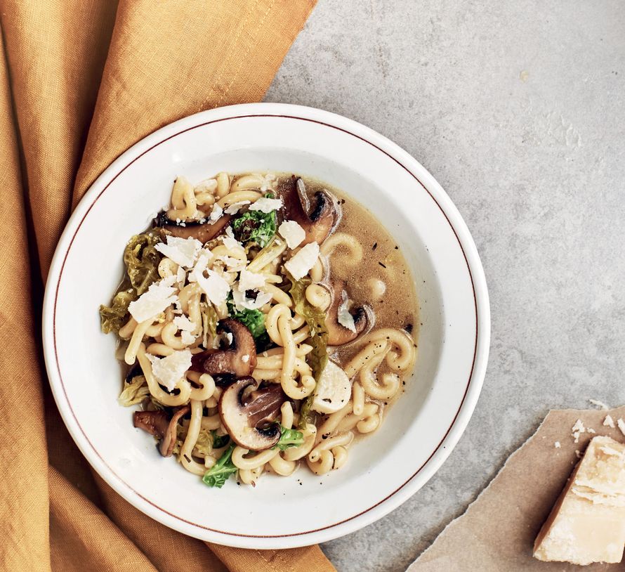 Valmis kasvisliemi, kuivatut yrtit, hyvä pasta ja juusto sekä muutama tuore kasvis riittävät muodostamaan tämän hiukan minestronea muistuttavan ruoan. Ohjeessa on käytetty sieniä ja kaalia, jotka ovat upea makupari, mutta ruoka onnistuu myös esimerkiksi kesäkurpitsasta ja pavuista.
