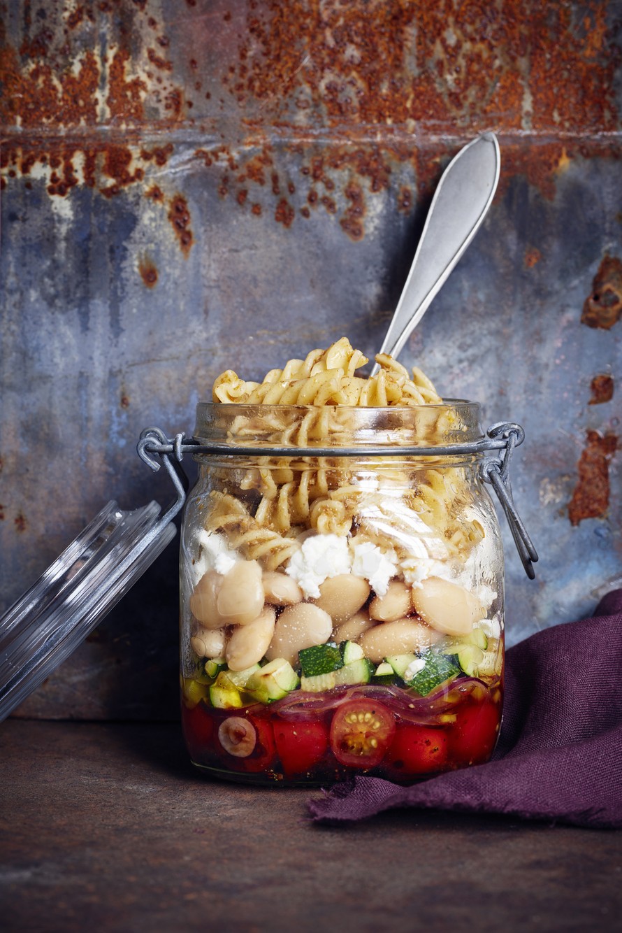 Purkkiin tehty pastasalaatti on täydellinen mukaan otettava lounas. Kasaa kasviksia, papuja, juustoa sekä pastaa kerroksittain purkkiin ja anna maustua jopa muutaman päivän ajan.