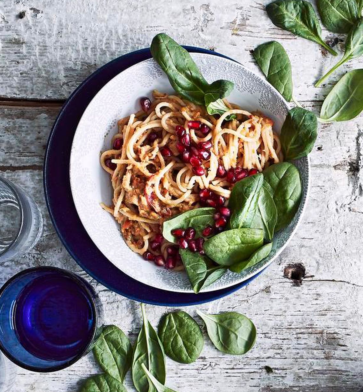 3. Keitä pasta ohjeen mukaan kevyesti suolalla maustetussa vedessä. Kaada kypsä pasta lävikköön ja takaisin kattilaan tai tarjoiluvadille. Sekoita kikhernepesto kuuman pastan joukkoon. Lisää päälle granaattiomenan siemeniä ja huuhdottuja babypinaatinlehtiä.