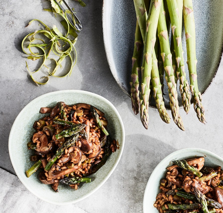 Syvänmakuinen parsarisotto onnistuu ilman voita ja parmesaania. Vegaanisen risoton täyteläisen maun takaa vaalea misotahna.
