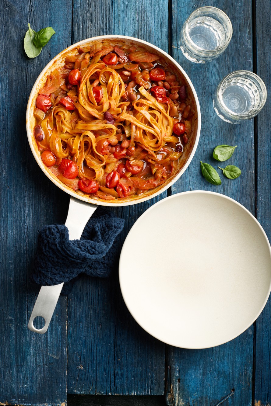 Ei turhaa tiskiä! Pasta kypsyy samalla pannulla kuin kastike. Helppoon bologneseen et aina tarvitse jauhelihaa. Kokeile vaihteeksi ravitsevia papuja.