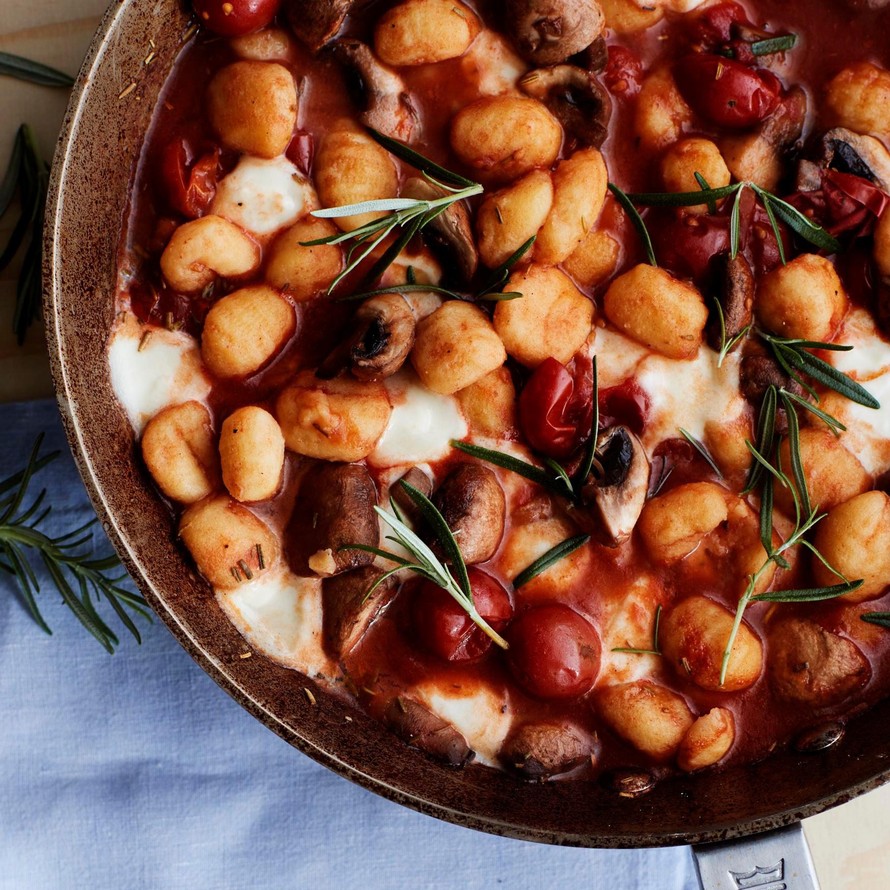 Hirmu helppo gnocchipannu valmistuu vartissa. Gnoccheja ei tarvitse esikeittää, sillä ne hautuvat kypsiksi tomaattiliemessä pannulla.