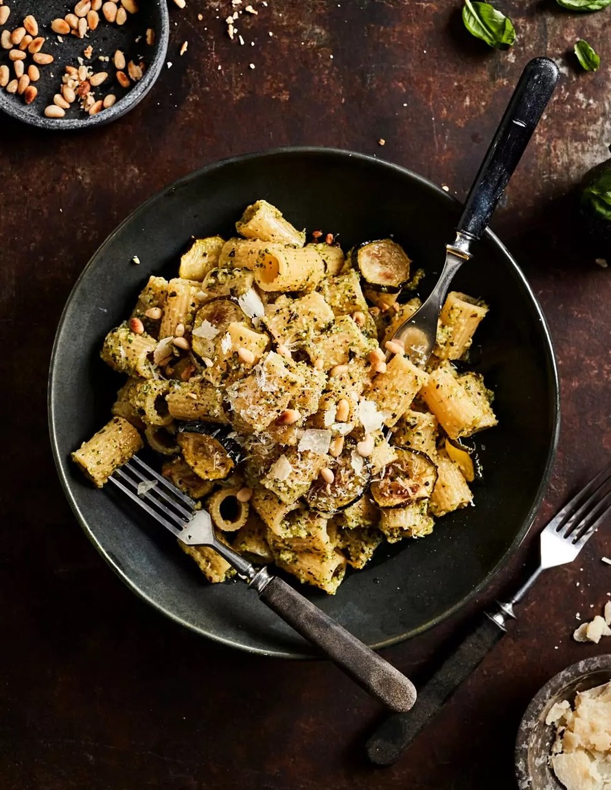 Kasvisten mieto maku saa paahtamisesta lisää ytyä. Uunissa paahdetuista kesäkurpitsoista valmistuu peston tapainen kastike parmesaanin, siementen ja yrttien kanssa.
