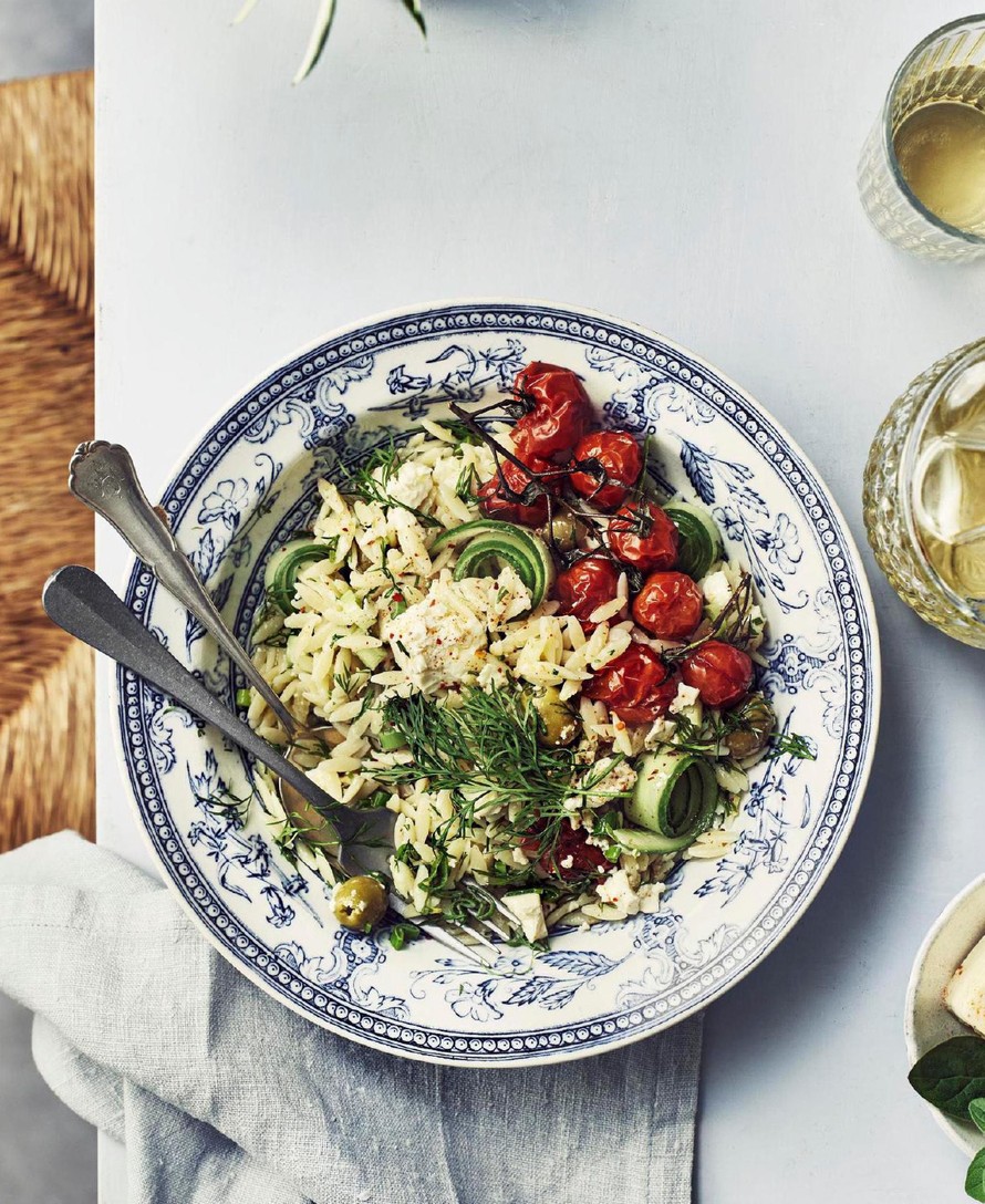 Ota kurkusta juustohöylällä suikaleita. Murustele feta. Yhdistä ne orzoon uunitomaattien ja oliivien kanssa. Hienonna joukkoon tilli. Tarjoa heti.
