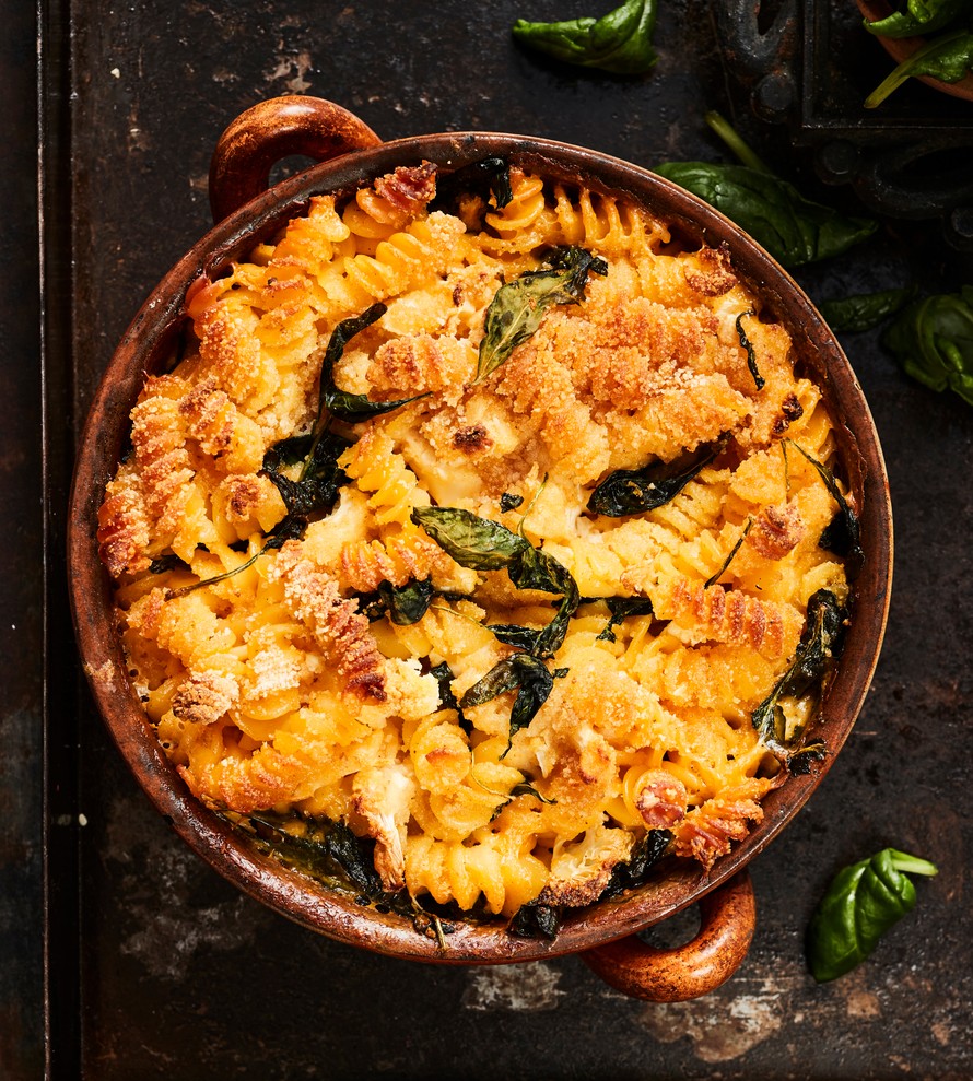 Mac & cheese eli juustomakaroni höystetään nyt kukkakaalimuruilla ja tuoreella pinaatilla. Helpotetussa ohjeessa kastike valmistetaan valuvasta cheddarsulatejuustodipistä.