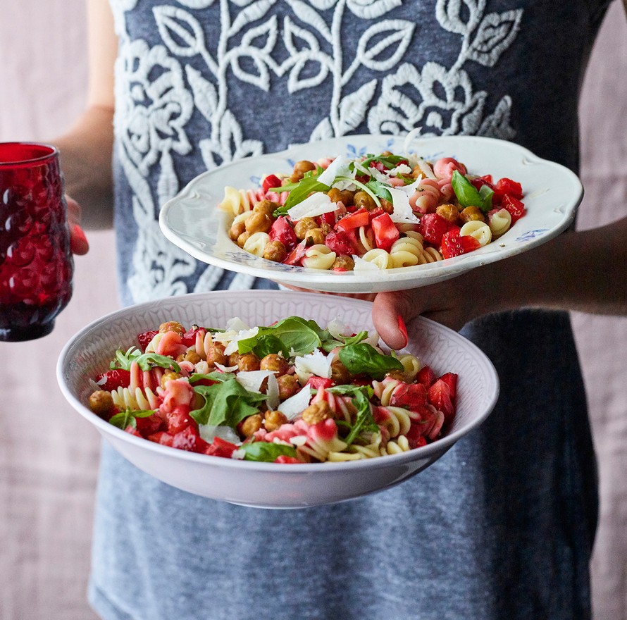 - Sekoita kastike, mansikat, kikherneet, rucola ja basilika kypsän pastan joukkoon. Tarjoa pasta parmesaanilastujen kanssa.