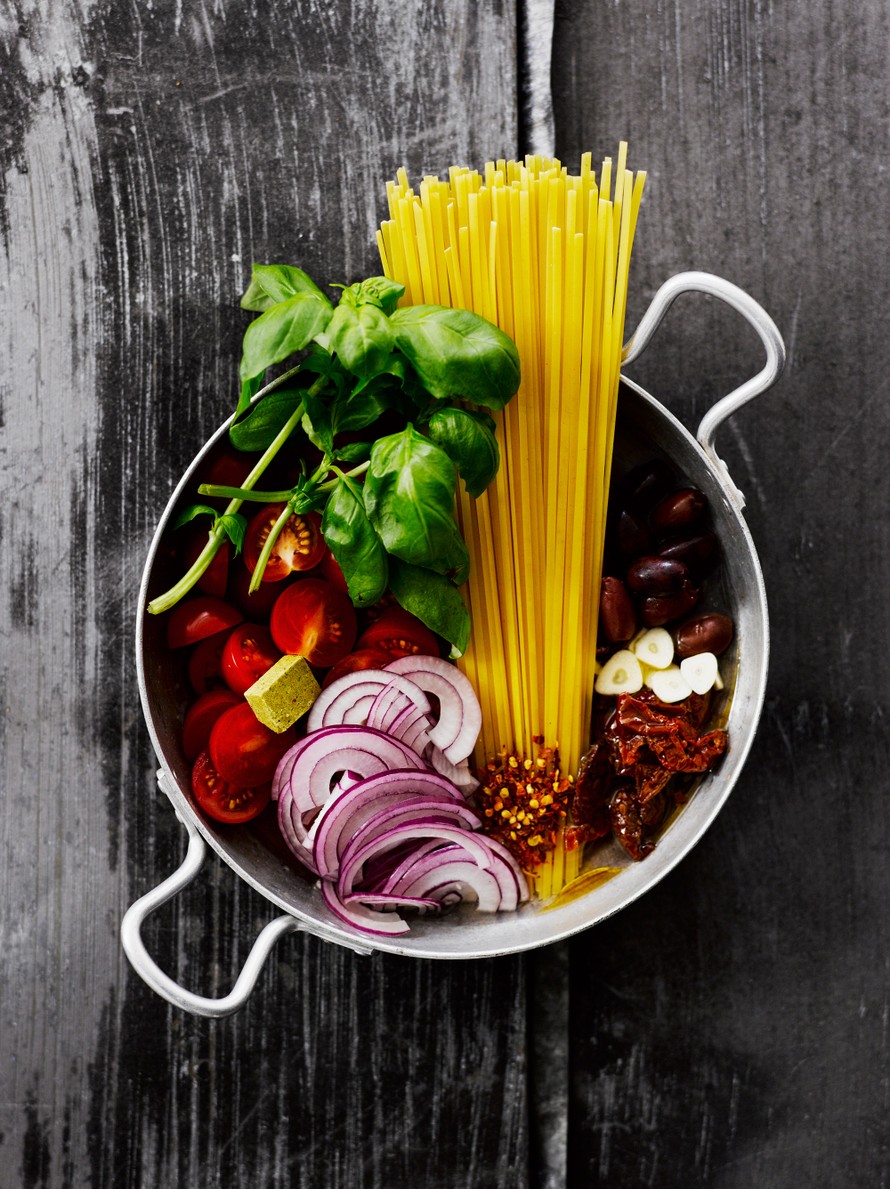 - Kuori ja viipaloi sipuli ja valkosipulinkynnet. Pane ne pastan, tomaattien, oliivien, liemikuutioiden, öljyn ja mausteiden kanssa isoon paistokasariin tai kattilaan. Kaada vesi päälle.