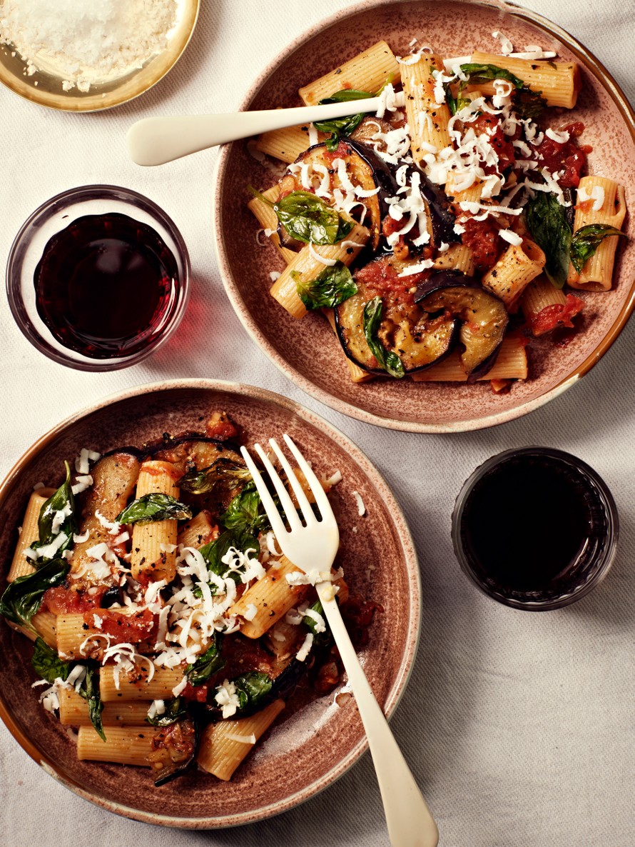 Revi basilikan lehdet ja kääntele yhdessä valutetun pastan ja munakoisoviipaleiden kanssa tomaattikastikkeen joukkoon. Raasta mukaan reilusti pecorinojuustoa ja laita loppu juusto tarjolle pöytään.
