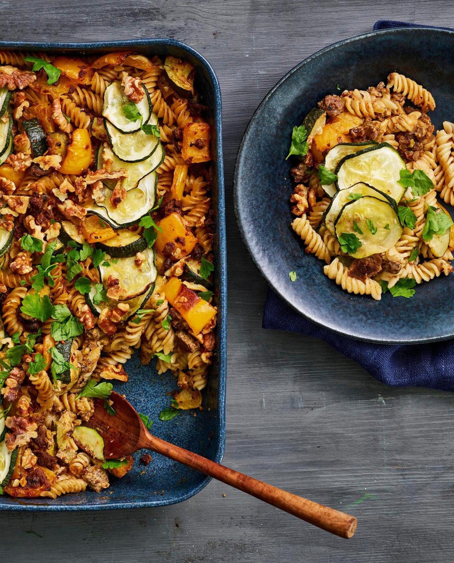 Laita uuni kuumenemaan 175 asteeseen. Voitele uunivuoka ja kaada pasta-härkisseos vuokaan. Lado kesäkurpitsaviipaleet päälle. Rouhi pähkinät veitsellä ja ripottele pinnalle. Kypsennä uunissa 35–40 minuuttia. Hienonna reilusti lehtipersiljaa valmiin paistoksen päälle.