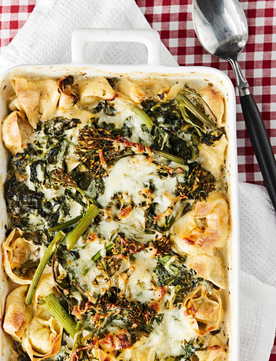 Pasta-pinaattivuoassa rouskuvat myös rapeat varsiparsakaalit.
