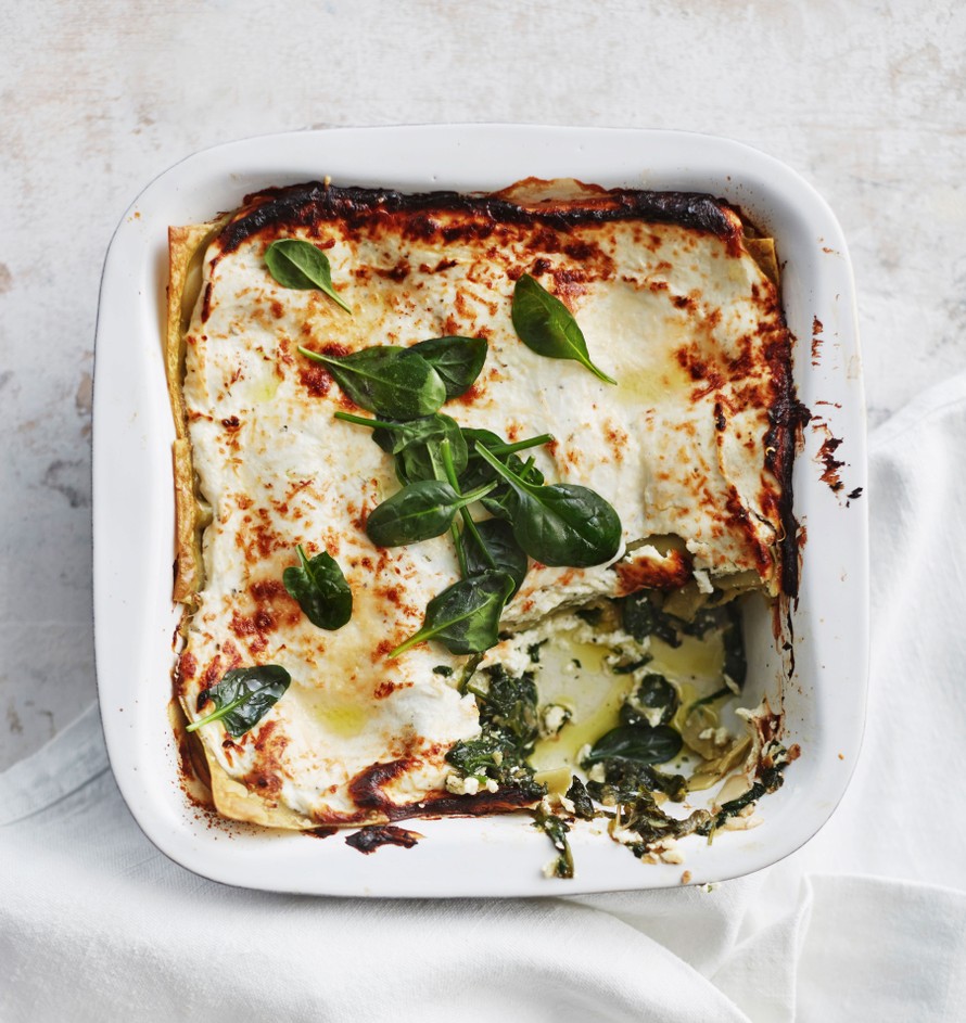 Oheisessa ohjeessa lasagne valmistetaan hieman toisin. Kerrosten väliin paistetaan yksinkertainen pinaattihöystö ja valkokastike korvataan puolestaan rahkatäytteellä, joka on rikastettu juustolla meheväksi.
