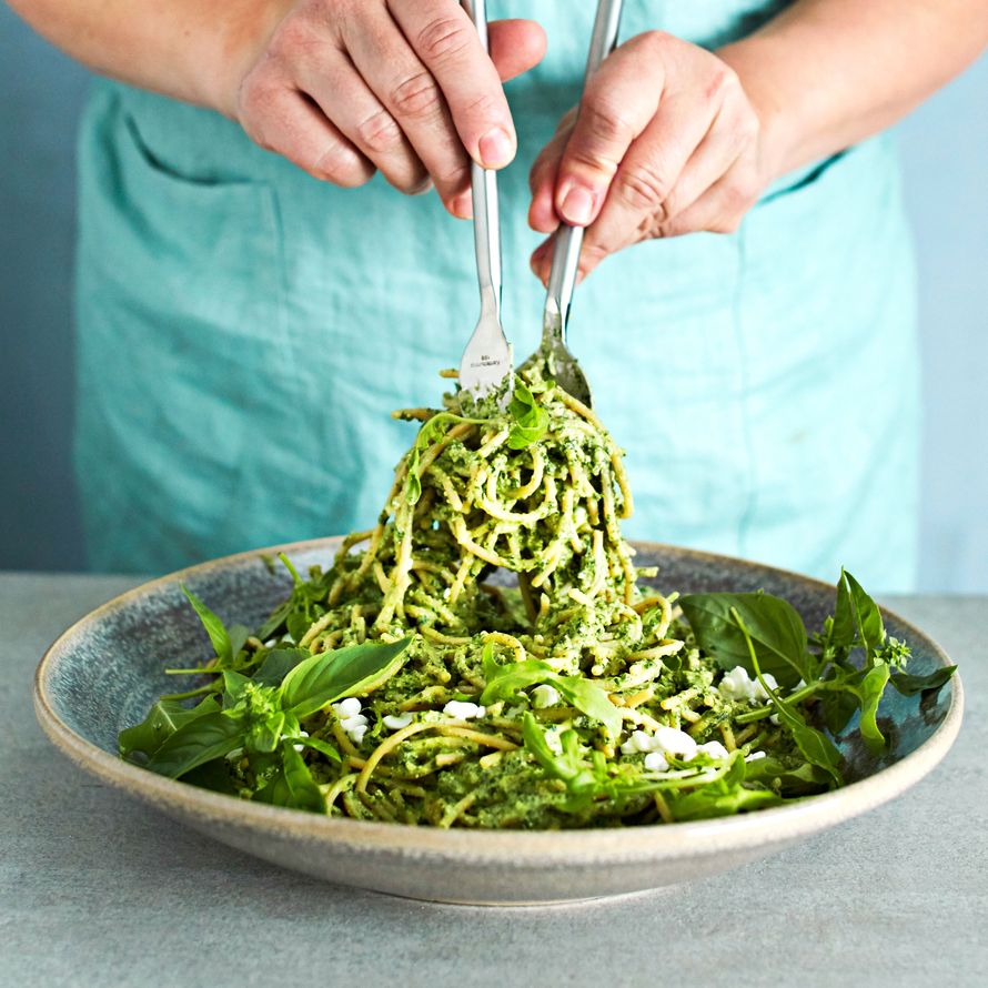 - Laita pasta takaisin kattilaan ja sekoita joukkoon pesto. Lisää pastan keitinvettä vähän kerrallaan ja sekoita voimakkaasti.