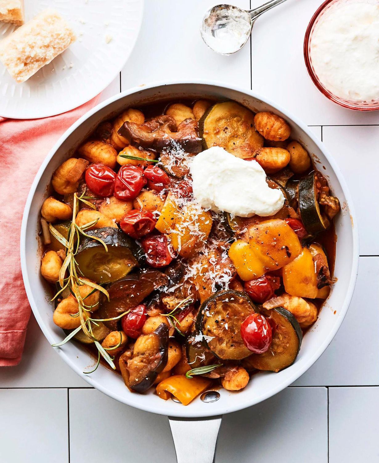 Tällä kertaa ratatouille tarjoillaan arkikelpoisessa muodossa. Kasvikset pilkotaan pieneksi, jolloin ne kypsyvät nopeasti. Lisäksi joukkoon kipataan paketillinen gnoccheja, jotka imaisevat kypsyessään liemen maut.