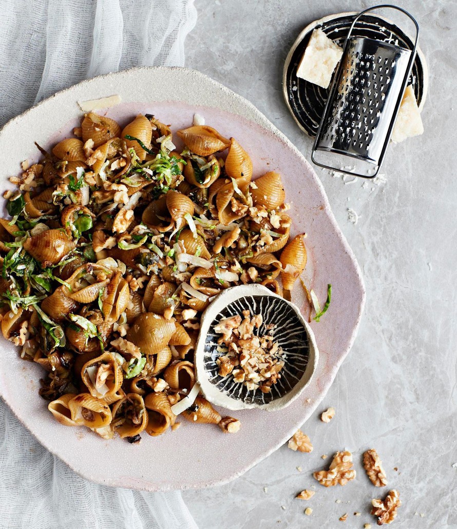 Nosta pasta vedestä pannuun ruusukaalien joukkoon. Sekoita ja lisää juustoraaste ja pähkinät.