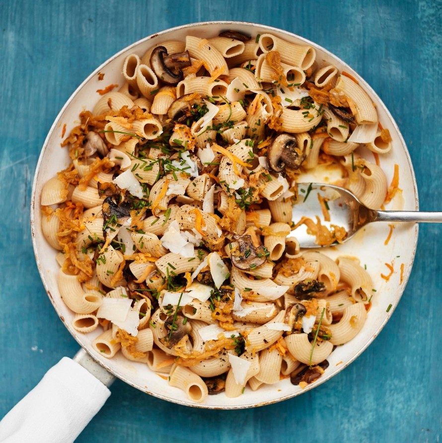 - Keitä pasta kypsäksi suolalla maustetussa vedessä. Kuori ja raasta bataatti karkeaksi raasteeksi. Hienonna sipuli. Paista bataattia ja sipulia öljyssä paistinpannulla noin 5 minuuttia.